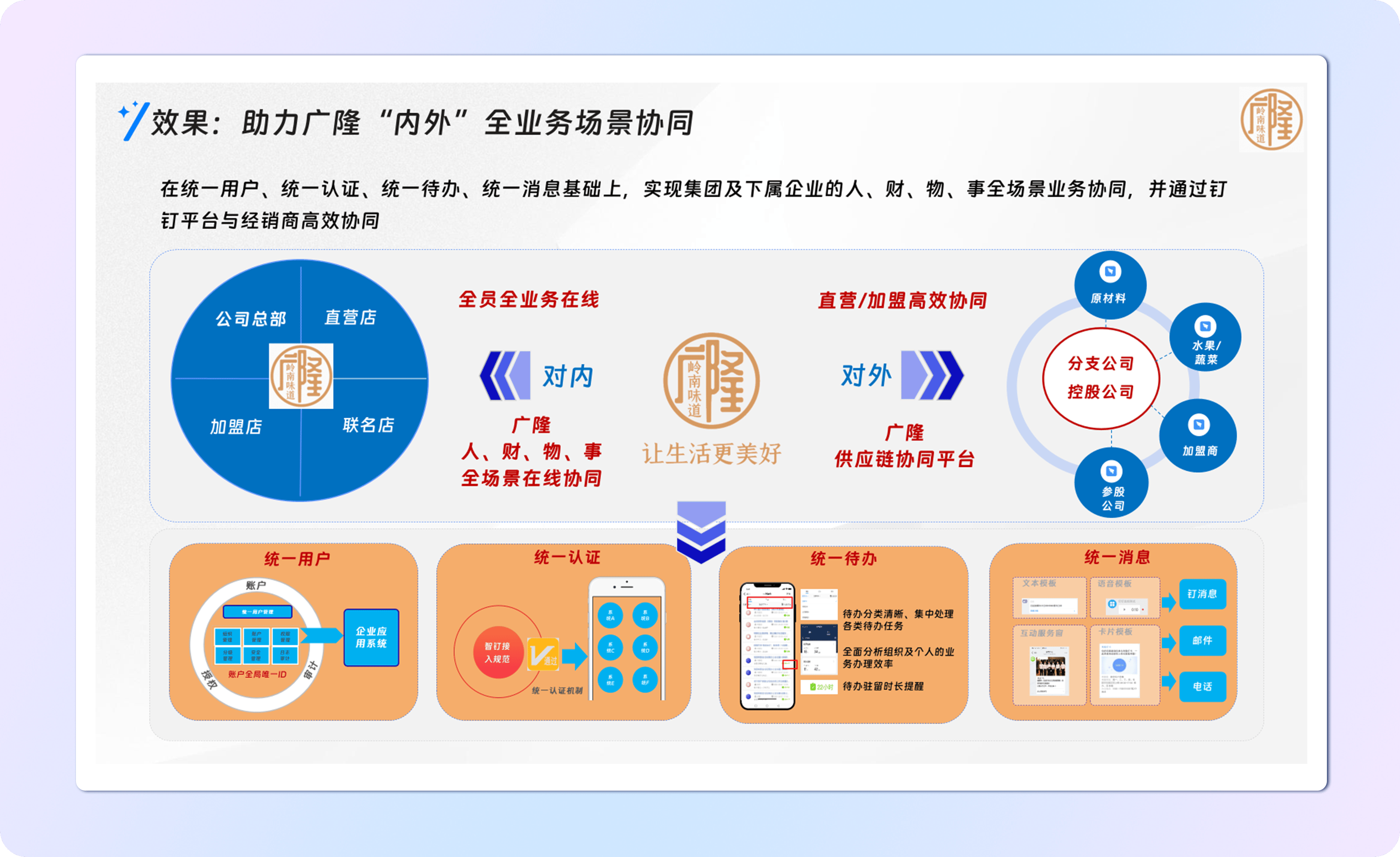 通过钉钉ipaas链接能力对接了人事、审批和业务系统,为广隆搭建了“一站式”业务审批逻辑,为业务的快速发展和门店的加速增开提供了高效协同能力