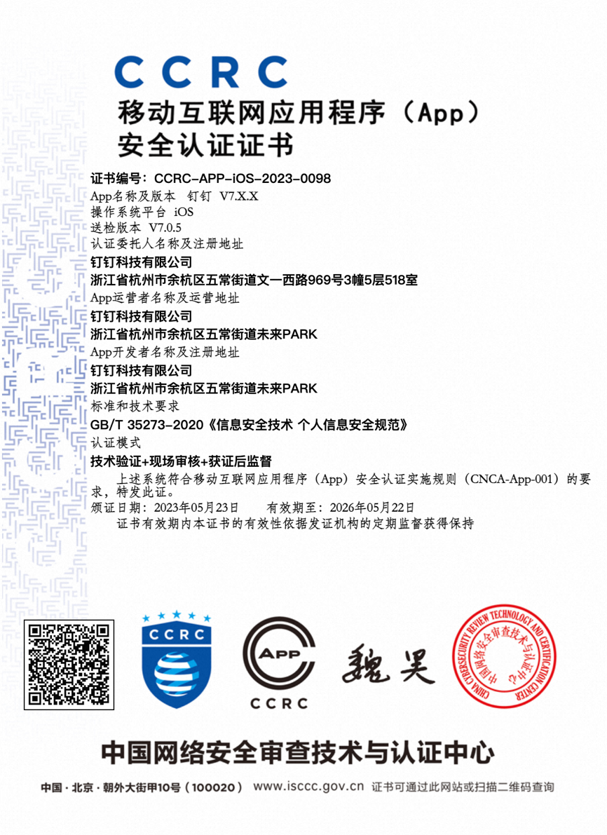 个人信息安全保护再获认可!钉钉通过中国网络安全审查技术与认证中心(CCRC)、国家信息技术安全研究中心的双重检测,完成“移动互联网应用程序(APP)安全认证”,成为办公领域中首款获得该认证的品牌。